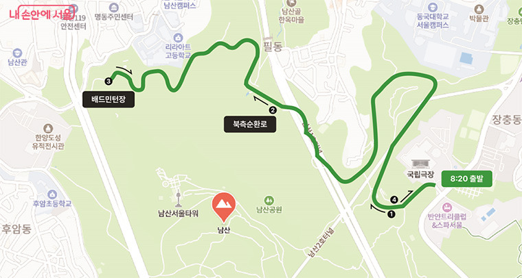 코스B(난이도: 중)는 오전 9시부터 7개 그룹으로 나뉘어 시간대별로 운영. 남산국립극장을 출발해 남측순환로 방향으로 자연생태길과 역사문화길을 지나 북측순환로를 따라 다시 국립극장으로 돌아오는 6.5km의 남산 순환 코스로, 약 2시간이 소요.